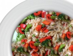 Na pánev si dáme lžičku kokosového oleje osmažíme cibulku a česnek, přidáme papriku, později na pánev přidáme již uvařené nudle spolu s brokolicí a mrkví a přidáme teriyaki omáčku smíchanou s trochou vody.