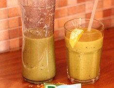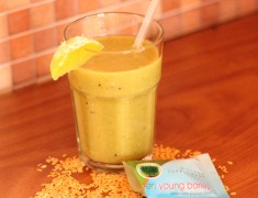 Tento nápoj má ingredience, které jsou výživově hodnotné, jako je zelený ječmen, který obsahuje minerály, vitamíny, enzymy, aminokyseliny a je zdrojem vlákniny a chlorofylu dále pak ovoce, které je zdrojem minerálních látek, vitamínů, vlákniny atd. a také jsem přidala len zlatý, který má protizánětlivý, protivirový, antibakteriální účinek, má jemně oříškovo máslovou chuť, takže se výborně hodí i do nápojů.